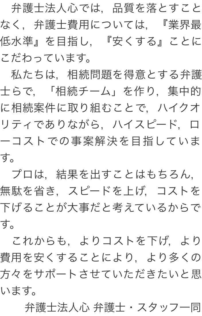 トップその他費用の安さにこだわる理由 階層構造▼ その他(目次) 費用の安さにこだわる理由 その他(目次)その他トップ心グループニュース相続放棄の電話相談・テレビ電話相談弁護士費用(詳細)費用の安さにこだわる理由お客様相談室その他の地域情報お役立ちリンク集関連リンク集プライバシーポリシー 受付時間 平日 9時~21時、土日祝 9時~18時 夜間・土日祝の相談も対応します (要予約) 所在地 〒514-0009 三重県津市羽所町345津駅前第一ビル5F (三重弁護士会所属) 0120-41-2403 お問合せ・アクセス・地図 お役立ちリンク